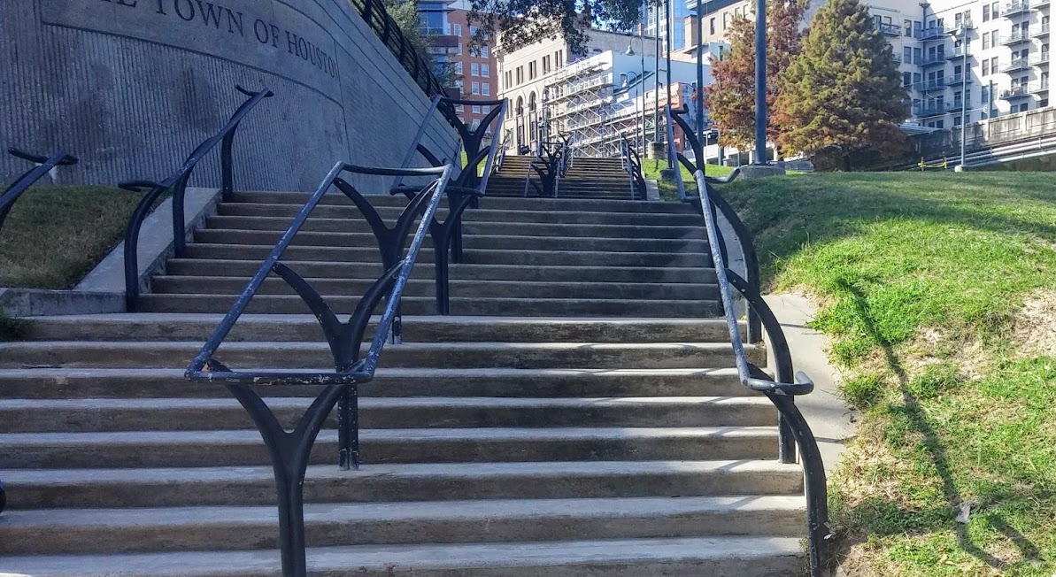 That building just to the left with the metal stairs is the Sunset Coffee Building which has been restored and housea the main offices of the Buffalo Bayou Partnership and home to Houston First Corporation. Also, this will be where to rent paddle crafts and bikes. On a side note, do not confuse it with the building on the right, that is the Harris County Jail. Fun fact, the windows are fake.